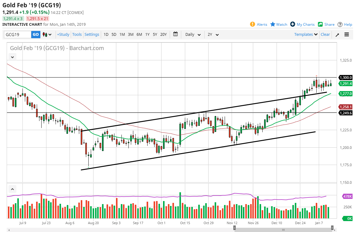 Gold markets tried to rally again to kick off the week on Monday, but as you can see, we have given back a bit of the gains. Gold markets will continue to be very choppy in this area, because we have recently broken out of an uptrend line, but we also have the psychologically important $1300 level above. Because of this, I think that it will remain incredibly tight and choppy, and that shouldn’t be much of a surprise considering how much confusion the Federal Reserve has thrown into the marketplace. Initially thought to be overly hawkish, now traders are starting to figure out whether or not the Federal Reserve is willing to raise rates at all in 2019. If they continue to look a bit dovish, then I think that gold will finally break out. In fact, it’s my best case currently.