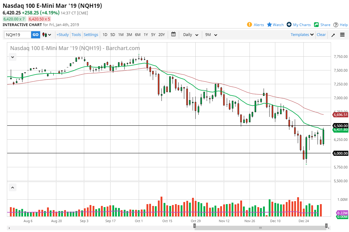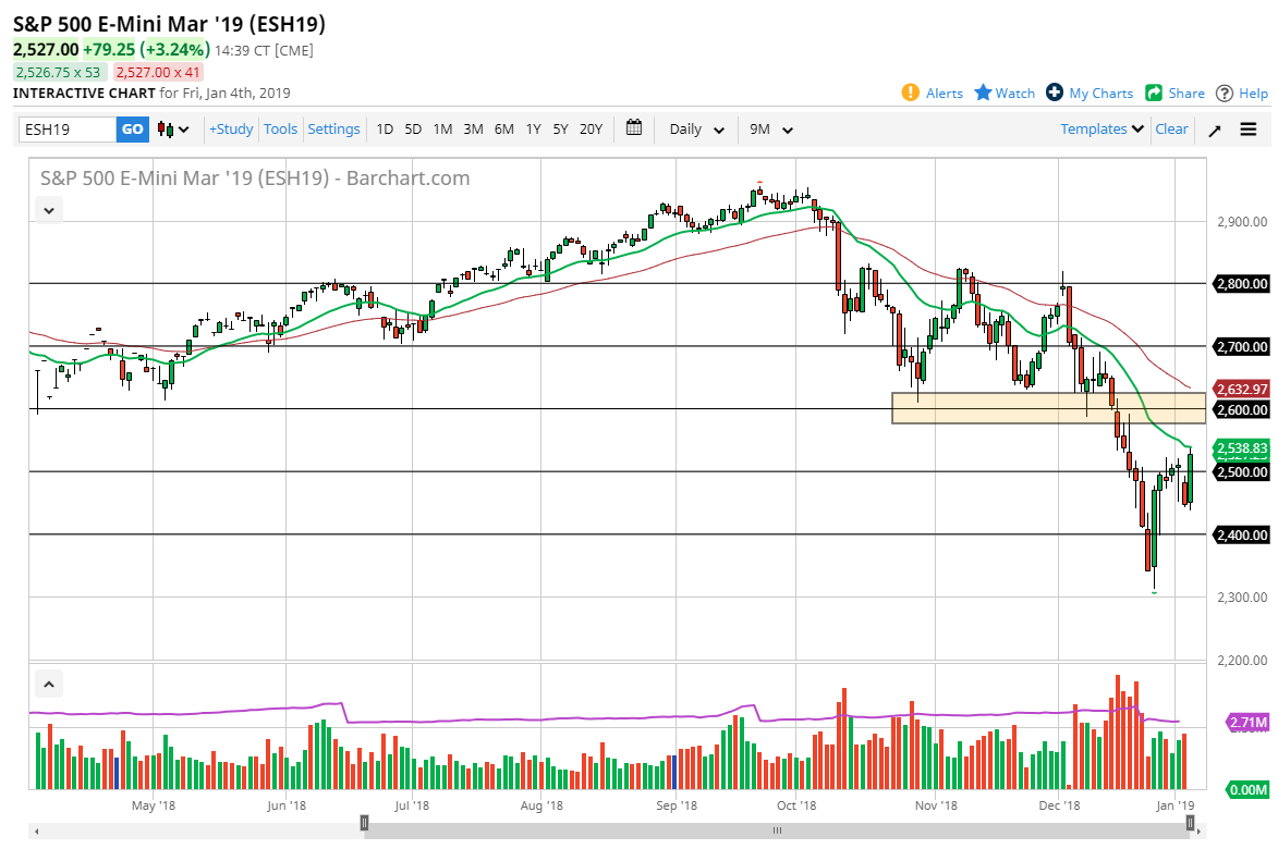 The S&P 500 has exploded to the upside after initially dipping slightly on Friday, with the “one-two punch” of a stronger jobs number than anticipated and the Chairman of the Federal Reserve, Jerome Powell, suggesting that perhaps the Federal Reserve was watching the markets, and therefore trader started to think about the “Fed put.” We have seen a 4% move to the upside, which of course is a very bullish sign, but we did pull back slightly from the 20 day EMA. However, even if we do break out to the upside I think we still have a lot of work to do to take out the negativity. The question is whether or not we can take out 2600 at this point, which we still have a way to go. I think the next couple of sessions will probably be bullish, but I’m looking to sell closer to the 2600 level.