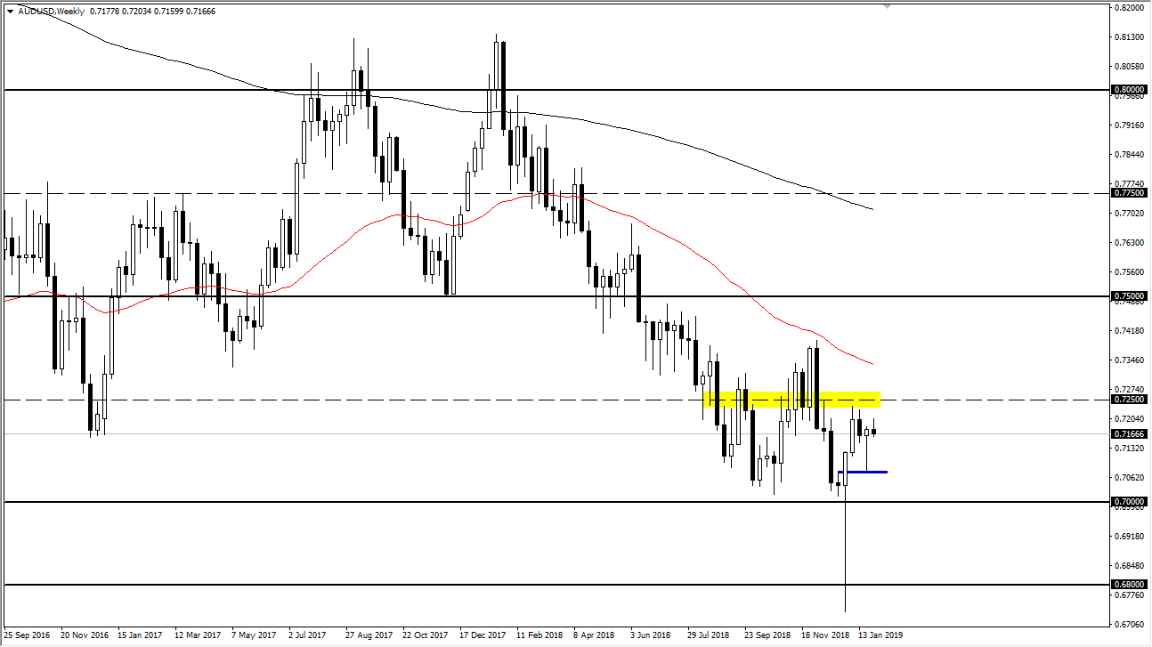 The Australian dollar has been very choppy over the course of the last month, and as we roll into the month of February, I think there are a lot of questions that will be answered during the month of February, not the least of which is going to be whether or not the US and China will get some type of resolution to the trade dispute that we have seen for quite some time. This being the case, I think the Australian dollar will rally a bit if we can get signs of an agreement, because Australia is a major contributor to raw material needs in China. So in a sense, it’s a bit of a supply chain play. That being said, the Federal Reserve is also looking a bit softer these days, so if we can get both of the things going at the same time, that will be a bit of a “perfect storm” for the Australian dollar, so I would be a huge buyer at that point.