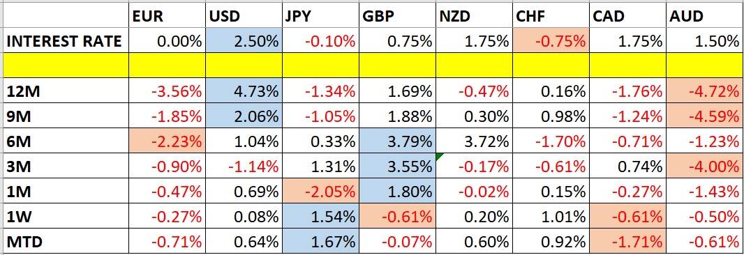 Let’s take a look at the relevant data of currency price changes and interest rates to date, which we compiled using a trade-weighted index of the major global currencies: