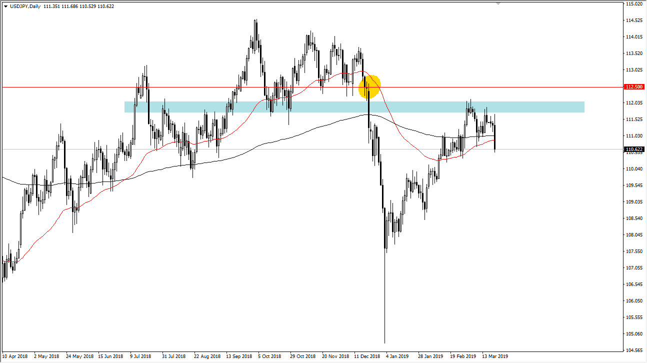 The US dollar initially tried to rally during the trading session on Wednesday but then turned around to break through the 200 day EMA, as well as the 50 day EMA. With that being the case, the market has cleared the ¥111 level as well, which of course is a very negative sign. At this point, it looks likely that we will continue to see sellers come in on short-term rallies, as the Federal Reserve has all but ruled out the potential of an interest rate hike in 2019. With that being the case, we will have less of a carry trade going forward, and that will of course where this pair down, perhaps to the ¥110 level. In general, this is a market that continues to be very choppy, but we may have finally made a decision on Wednesday.