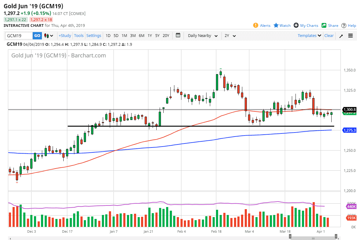 We are currently sitting just below the 50 day EMA and the $1300 level, so it makes sense that there is a little bit of resistance just above. I believe that part of this was due to the US dollar strengthening but then giving back quite a bit of this gains later in the day. It makes sense considering that it was the day before Nonfarm Payroll Friday, and of course that will have its say as to where the greenback goes going forward, so a lot of traders probably didn’t want to be overly exposed one way or the other.