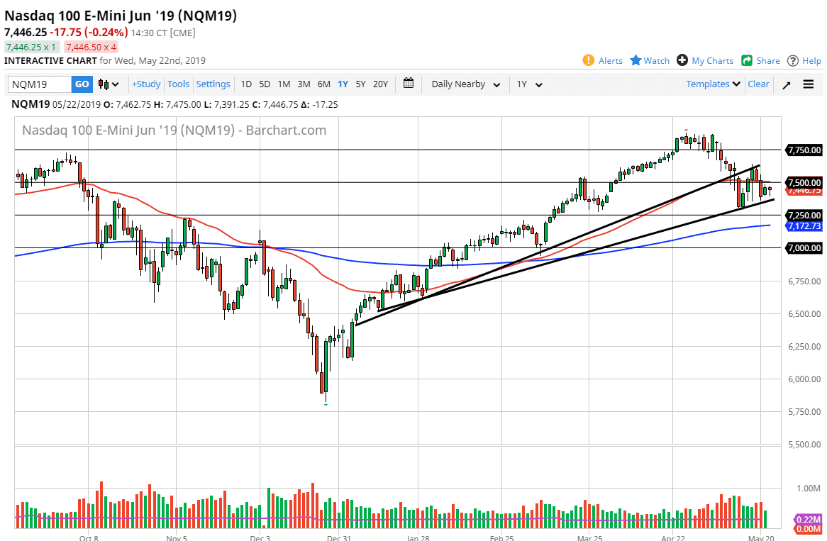 The NASDAQ 100 is firmly in the crosshairs of the US/China trade war. That being said, we have formed a hammer during the trading session on Wednesday and that of course is a good sign. If we can break above the 7500 level we could go to the 7600 level before facing resistance in the form of the previous uptrend line that we had broken through. However, we turned around to break down below the uptrend line that is just underneath, that could send this market looking towards the 7250 handle, perhaps down to the 200 day EMA pictured in blue.
