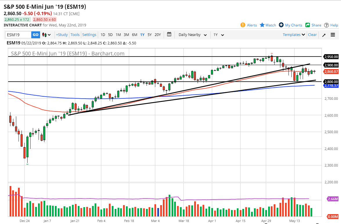 The S&P 500 went back and forth during trading on Wednesday as we continue to dance around the 50 day EMA. I don’t know what kind of catalyst will move the market next, as we are waiting for some type of momentum. Looking at the chart, I think that the 2900 level above will continue to be resistance, just as the 2800 level underneath will be supported. We are stuck between two uptrend lines, so of course it makes sense that there’s a lot of confusion at this point from a technical perspective.