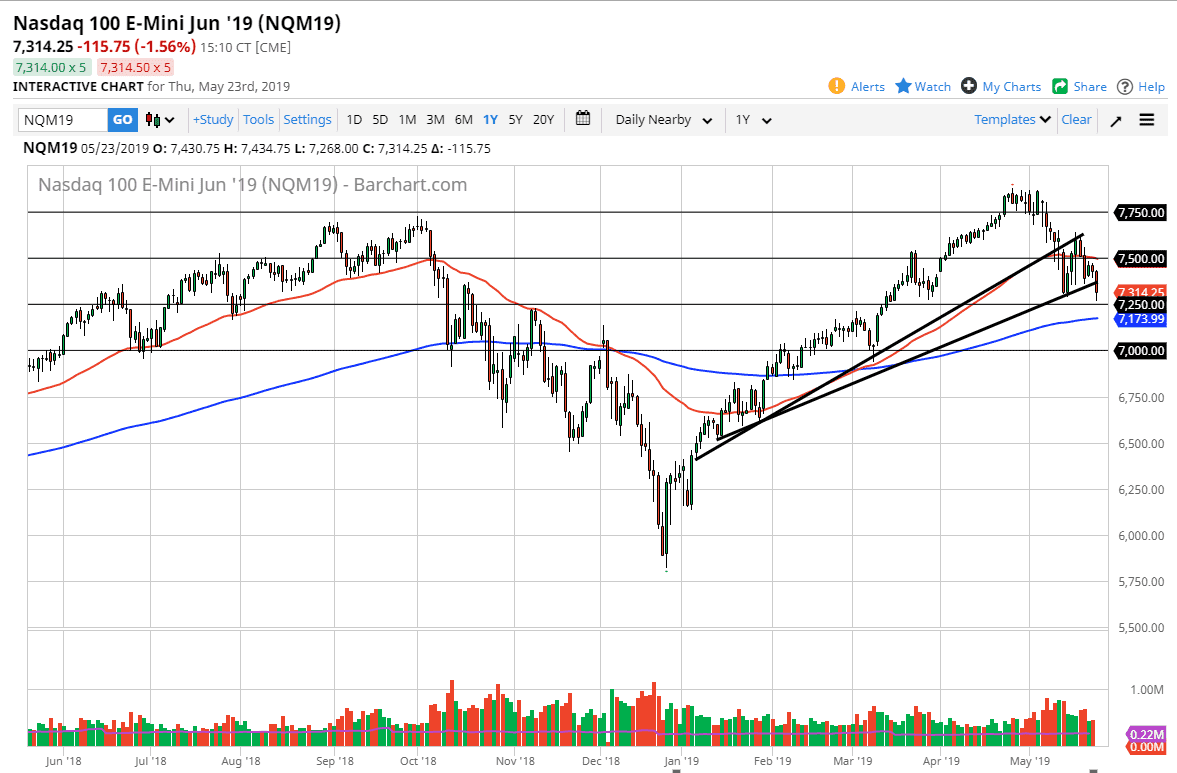 The NASDAQ 100 also broke down through an uptrend line, reaching down towards the 7250 level, that is your next support level, and at this point I think short-term rallies are selling opportunities. Signs of exhaustion are sold on short-term charts, and quite frankly I have no interest in buying this market because of the US/China trade war so it’s very likely that short-term rallies will continue to offer opportunity to the downside. I think it’s not until we break above the 7500 level on a daily close that my mind would be changed. This is a market that looks as if it is in the midst of a major trend change, and the extreme volatility that we have seen as of late continues to be an issue.