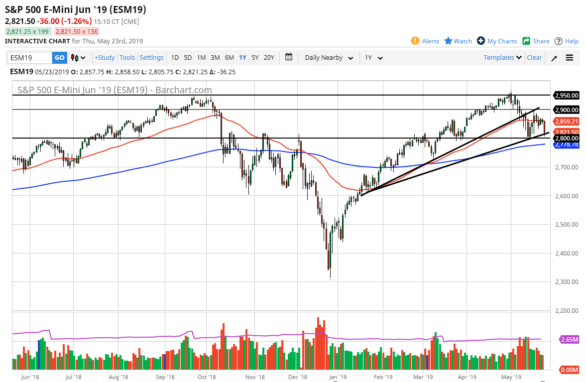 The S&P 500 broke down during the trading session on Thursday, slicing through the uptrend line that I have painted on the chart. However, we have turned right back around to show signs of life again, so it’s a bit difficult to get excited quite yet, but clearly we had a horrific day during the trading session. The 2800 level underneath continues to be important, and as long as we can stay above there, the market is very likely to stay somewhat resilient. However, we have seen a lot of concerns globally, so it looks to me like the market will probably sell rallies until we break down below the 2800 level and get things going much quicker. It’s obvious that market participants are starting to worry about the US/China trade situation and of course the Federal Reserve perhaps being a bit more hawkish than expected.