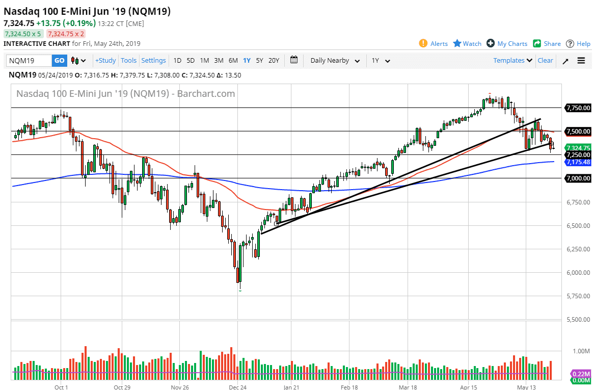 Don’t forget that the NASDAQ 100 is “Ground Zero” when it comes to the US/China trade situation due to all of the technology companies involved in that scenario. With this being the case, I suspect that the NASDAQ 100 will continue to be soft.