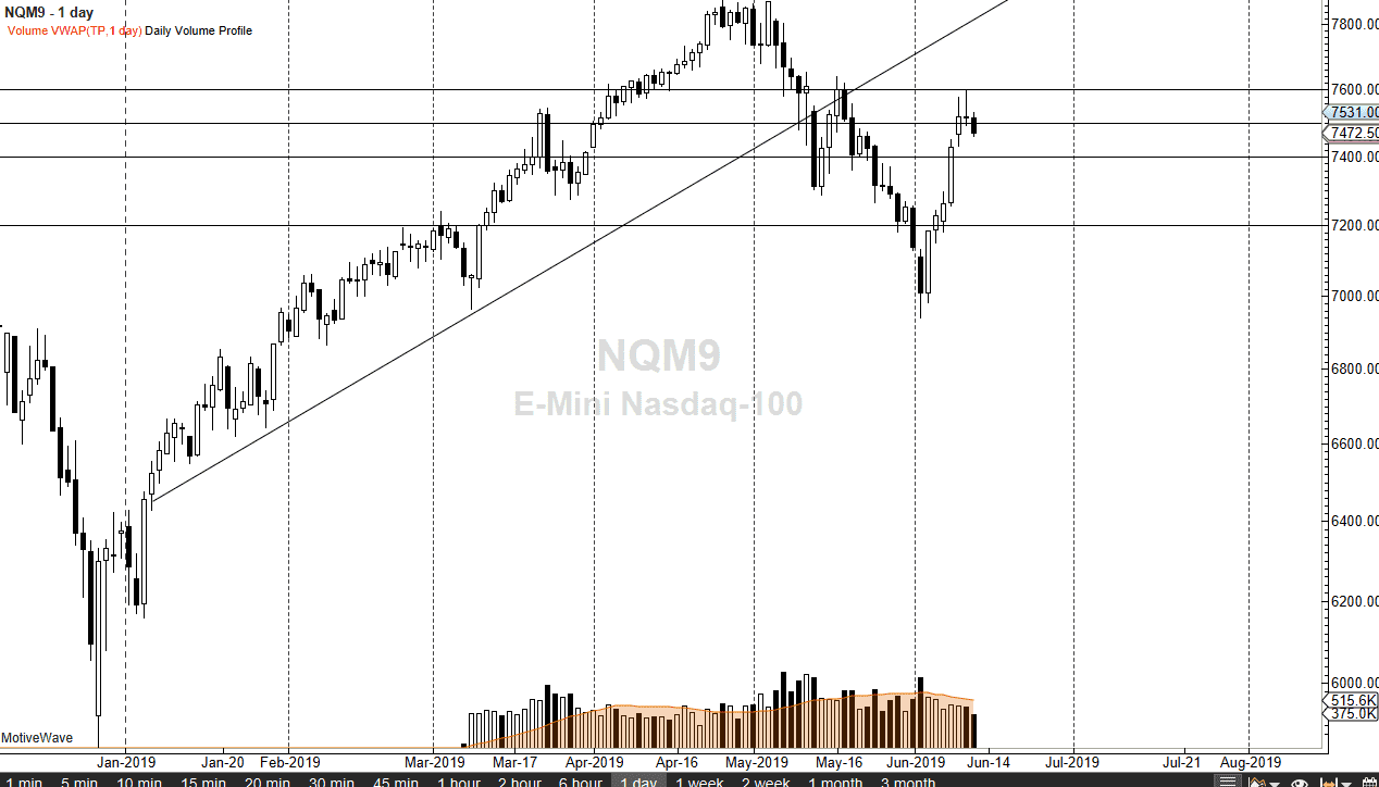 The NASDAQ 100 also looks a bit overstretched and tired at this point, so I suspect that we are probably going to go looking towards the 7400 level. This makes a lot of sense, because the United States and China are in the trade war that doesn’t seem to be letting up, and therefore technology companies will probably get hammered. The candle stick from the session on Tuesday was a perfect shooting star at the perfect place, and I don’t believe in coincidences. 7400 will be targeted initially on a break down below the lows of the trading session on Wednesday, but we could go as low as 7200 after that as we simply grind back and forth and look for some type of clarity.It just doesn’t look like there is a lot of conviction.