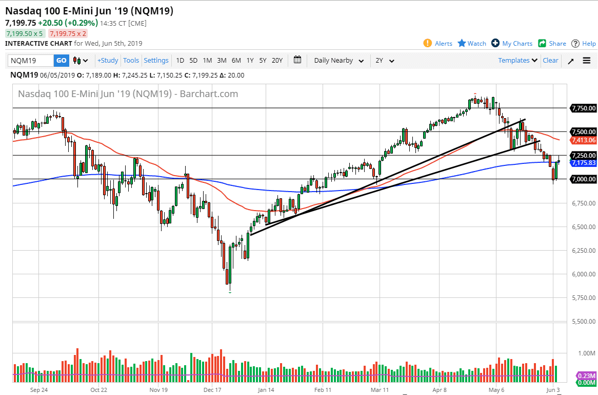 The NASDAQ 100 rallied during most of the session on Wednesday but ran into resistance at the 7250 level. If we can break above there, then it’s very likely that we could continue to go higher. However, if we rollover and break back below the lows of the trading session for Wednesday, that could send this market looking towards the 7000 handle underneath. That would be massive support, and a break down below there could really send this market much lower. I expect a lot of noise in this area, but ultimately this is a marketplace that will continue to move based upon the US/China situation as it is so sensitive to trans-Pacific trade.