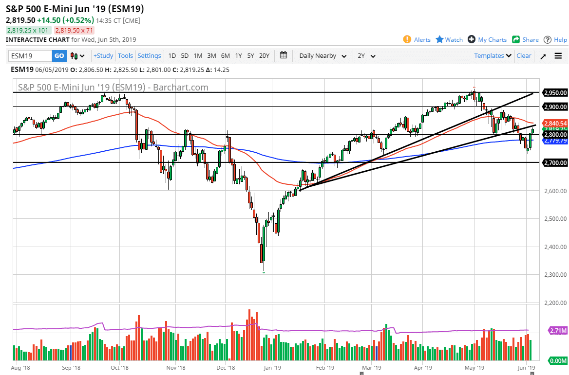 The S&P 500 rallied significantly during the trading session on Wednesday, as we are testing the bottom of an uptrend line that previously had been so important. The fact that we are close towards the 50 day EMA should bring in some selling pressure. At this point, there is a lot to work through but we also closed at the top of the range, which is bullish. At this point I think that Thursday has a lot of potential to be very choppy and back and forth, because beyond that we have the added specter of the jobs number coming out on Friday. This is probably not a market that you are going to be trading much during the day unless of course you can trade short-term range bound systems. A break above the 50 day EMA is very bullish and could send this market higher. However, if we break back below the 2800 level, the market could drop from there to continue the negative pressure.