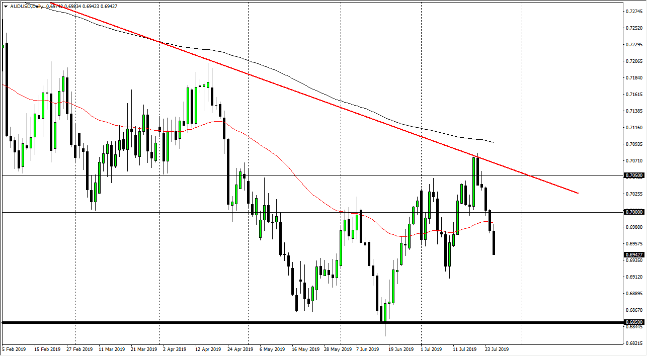 Headlines can and will come out to throw the Aussie around, not the least of which will come out of Beijing or Washington. Beyond that though, we also have the Federal Reserve that looks very likely to cut interest rates, so at this point I do believe that the Australian dollar is trying to find some type of bottom, but this is almost always a very noisy thing. With that in mind, it comes down to a lot of longer-term money being able to come in, buy the currency, and simply sit and wait for the fundamental analysis to show itself in the technical analysis. Longer-term I do think that we will eventually look at this range as the bottom of the market in the beginning of the uptrend, but the question is whether or not you can trade in this type of environment and protect your trading capital to take advantage of this. As a result, I have been buying this pair occasionally in 1/10 the size that I normally trade in and simply add or subtract in order to keep a “core position” going. If we were to break down below the 0.68 level though, that would be a huge “flush” in the Aussie.
