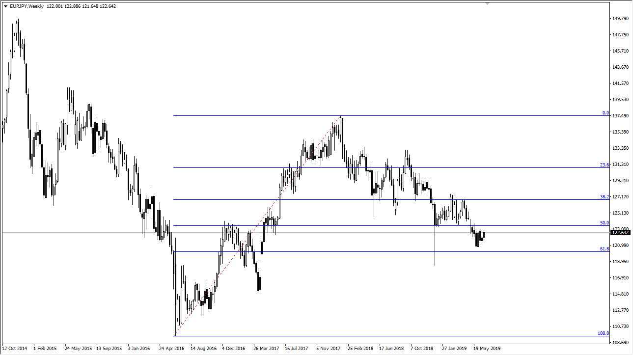 Against that backdrop, it appears that we should see a significant amount of bullish pressure in the Euro in general. Marry that with the idea of the Japanese yen losing a bit of strength toward the end of the month, we could have a bit of a “perfect storm” for the EUR/JPY pair to rally. We have recently reached down towards the 61.8% Fibonacci retracement level in this market and have reacted quite nicely. The last month has seen a bullish candle, a pullback, a hammer, and then eventually another rally. That is a good sign that buyers are starting to pick this market up “on the cheap.”