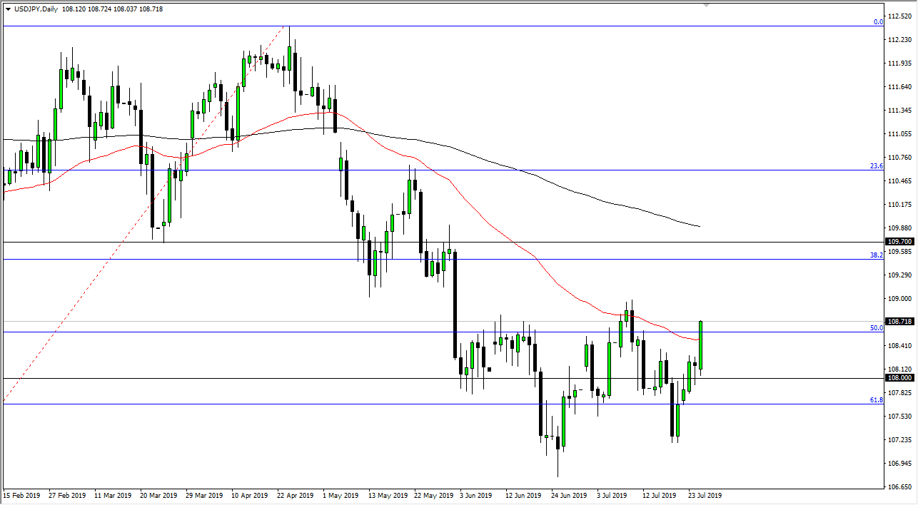 The US dollar has broken to the upside during the trading session on Thursday, clearing the 50 day EMA which of course is a very bullish sign. Quite frankly, this has been a very explosive move and it looks like we are going to try to take out the ¥109 level. That’s an area that of course will cause a certain amount of attention, but if we can break above there it’s likely that the market then goes to the ¥109.70 level next.