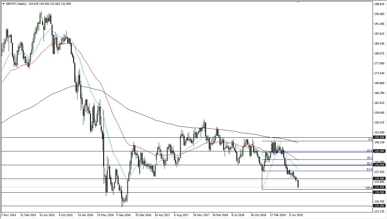 The British pound has broken down rather significantly late in the month of August, as we continue to see a lot of negativity around Sterling in general. As I write this, we are getting close to the 100% Fibonacci retracement level of the bounce that we had seen just above the ¥130 level, and now it looks likely that we are going to test that hammer that sent the market back to the upside, and if we break down below there, which is likely, then we could go lower.