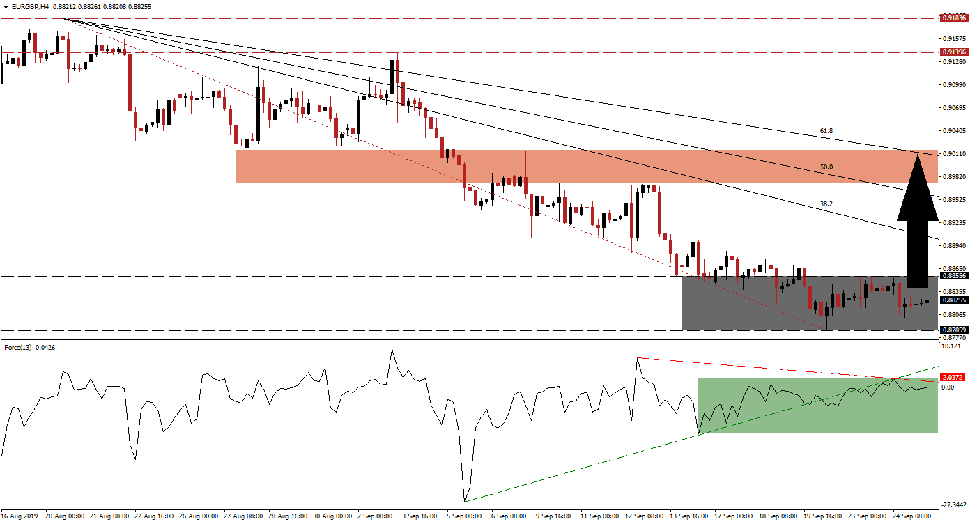 While the Euro is faced with a slowing economy over the past twelve months, in line with the slowdown in the global economy, a short-term rally in the EUR/GBP should be expected. As price action is trending sideways inside of its support zone, located between 0.87859 and 0.88556 which is marked by the grey rectangle, the Force Index should be closely monitored. In case the current uptrend will be able to push this technical indicator into positive territory and above its descending as well as horizontal resistance level, a breakout in the EUR/GBP should follow. The intra-day high of 0.88937 will play a key role in order to determine if a breakout is sustainable; this market the high recorded during a previously failed breakout and will bring price action close to its 38.2 Fibonacci Retracement Fan Resistance Level.