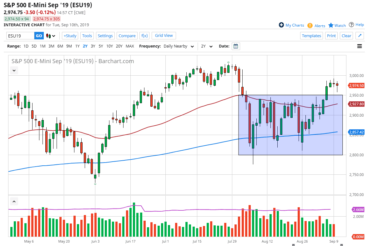 The ECB will be easing monetary policy this week, and of course the Federal Reserve will be doing so shortly as well. That’s all stocks care about at this point, so that gives you an idea as to which direction we are going. Based upon the consolidation area that we have just broken out of, we should be looking for a move towards the 3100 level, which is the longer-term target. I don’t think it happens overnight, and I certainly think that it will be very choppy and difficult between here and there but certainly that’s the direction we are going.