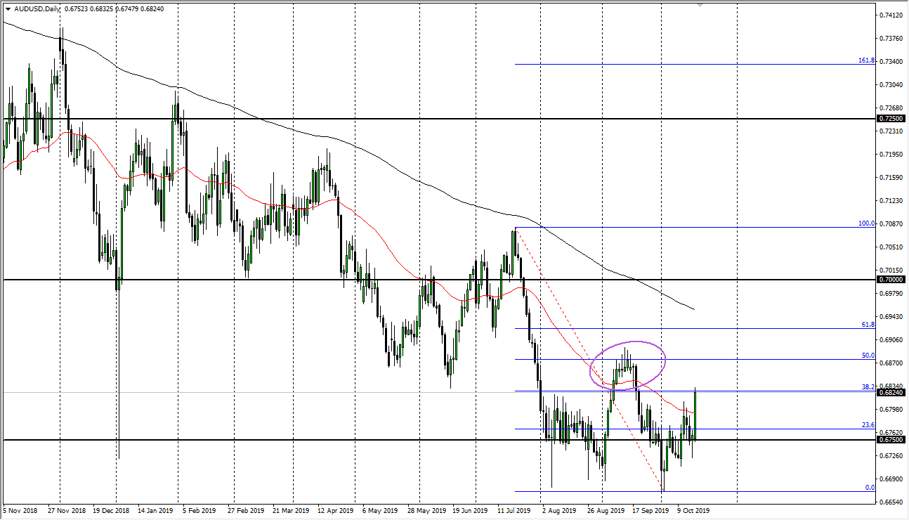 The size of the candle stick is of course rather important, as it does show that there is a lot of strength, but at this point in time it is obvious that we are still very much in a downtrend. Overall, the market does continue to favor selling as the Australian dollar does of course move right along with the US/China trade situation. Australia provides China with most of its raw materials for both construction and manufacturing, so at this juncture it’s very unlikely that Australia will take off for the longer-term. That being said, if we were to break above the 0.70 level then you have to stand up and pay attention. The 200 day EMA of course attracts a lot of attention as well as it is a longer-term trend defining indicator. I suspect in the short term we will probably see a failure sooner rather than later, and then give us an opportunity to reach back towards the 0.6750 level which has been very sticky when it comes to trading action. I have no interest in buying this pair yet, but don’t have a signal to start selling. Essentially I have to wait to see what the 50% fib ends up going to the market once we reach there.