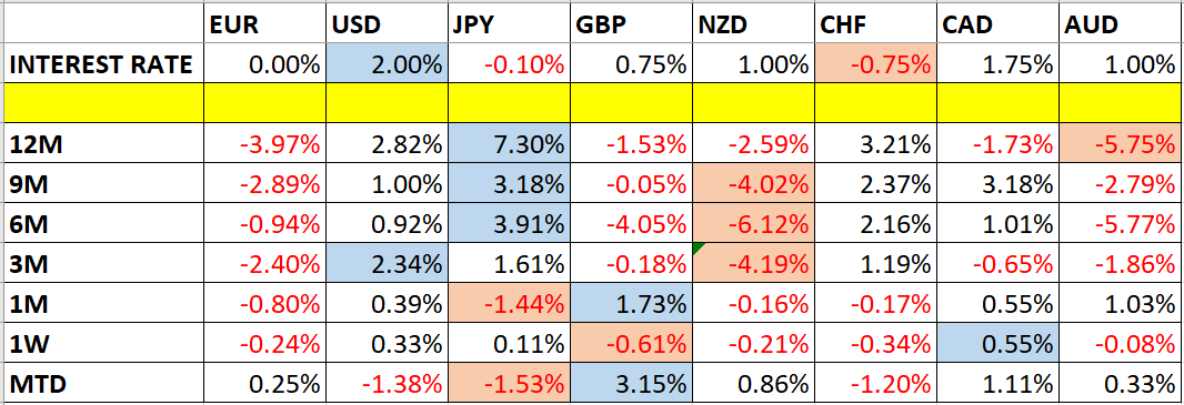 Let’s look at the relevant data of currency price changes and interest rates to date, which we compiled using a trade-weighted index of the major global currencies: