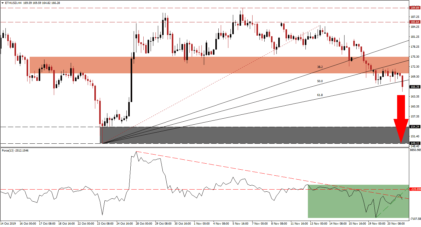 With the rise in fundamental bearish pressures and the current breakdown-in-progress, the ETH/USD should have a clear path into its support zone which is located between 149.22 and 154.24 as marked by the grey rectangle. Due to the long-term fundamental developments in Ethereum, another breakdown remains an option. The next support zone awaits this cryptocurrency pair between 118.31 and 123.51, this includes a previous price gap to the upside. You can learn more about a price gap here.