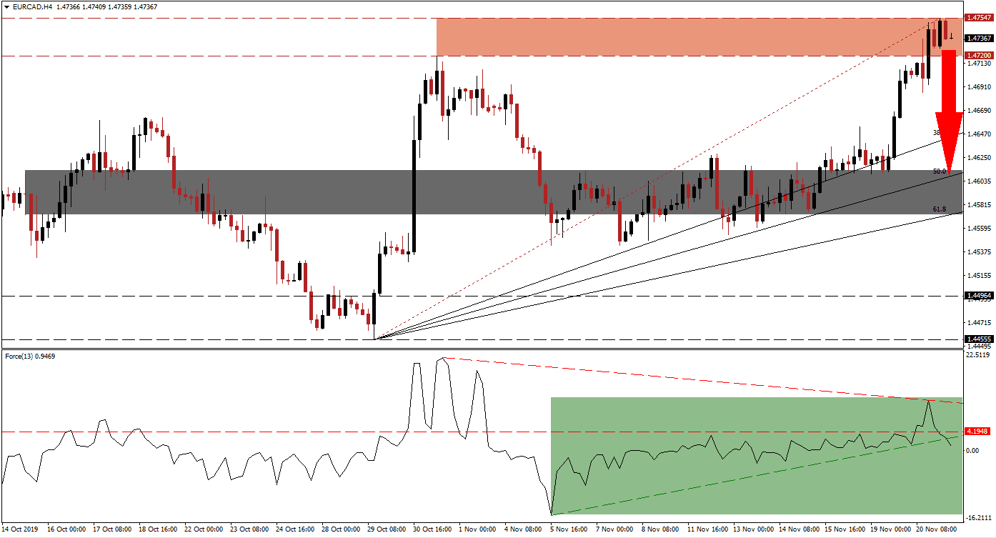 The Force Index, a next-generation technical indicator, is flashing three warning signals which confirm that a price action reversal is imminent. A negative divergence formed as the EUR/CAD moved into its resistance zone with a higher high; this bearish development resulted in a momentum loss and the Force Index completed a breakdown below its horizontal support level, turning it into resistance. This technical indicator has now additionally moved below its ascending support level and turned it into temporary resistance as marked by the green rectangle. A breakdown in the Force Index into negative territory is expected to lead this currency pair into a corrective phase. You can learn more about the Force Index here.