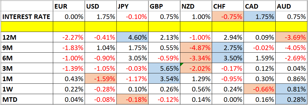 Let’s look at the relevant data of currency price changes and interest rates to date, which we compiled using a trade-weighted index of the major global currencies: