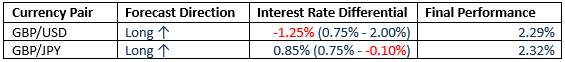 For the month of October, we forecasted that the best trades would be long GBP/USD and long GBP/JPY. The final performances were positive, as shown below: