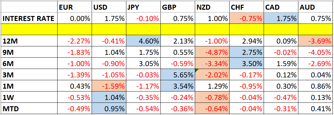Let’s look at the relevant data of currency price changes and interest rates to date, which we compiled using a trade-weighted index of the major global currencies: