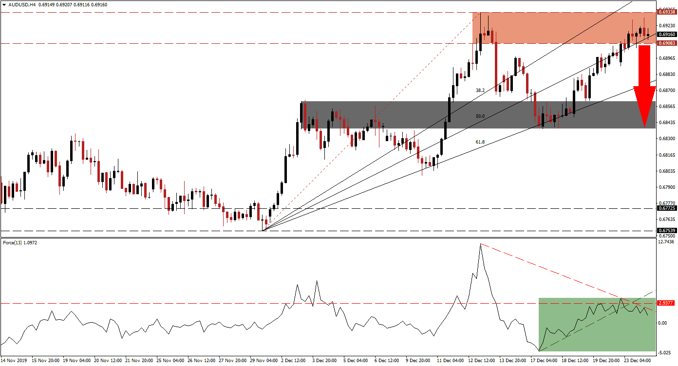 Thin trading volume due to the holiday-shortened trading week helped the AUD/USD ascend into its resistance zone. Bullish momentum started to recede and increased breakdown pressures for this currency pair. The Australian Dollar is the top Chinese Yuan proxy currency, and traders have accepted that that announced phase-one trade truce between the US and China is positive, at least for now. Year-end portfolio adjustments may be the biggest driving force for price action this week, and a short-term sell-off on the back of a profit-taking sell-off is anticipated.