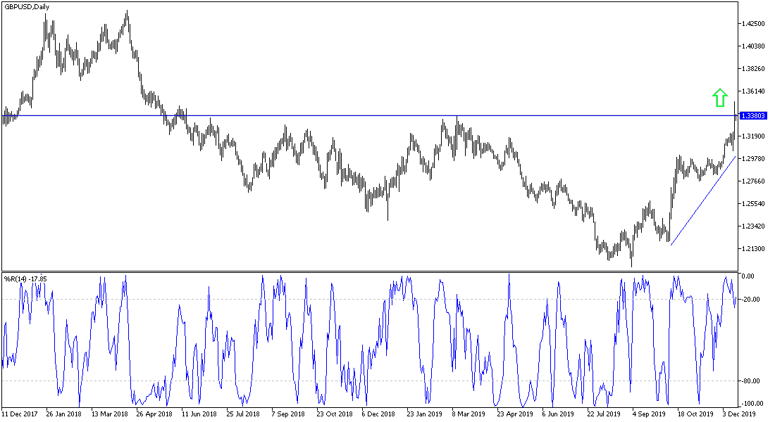 At the end of last week’s trading, and with the announcement of a major victory for the Conservatives in the general elections that took place in the United Kingdom last Thursday, the best opportunity was for an upward price gap for the GBP/USD to start from 1.3160 support to reach the 1.3514 resistance, the highest level since May 2018. However, with the market price ending its gains after winning, the pair quickly reverted to the 1.3305 level, before closing the week's trading around the 1.3333 resistance. Prime Minister Boris Johnson is scheduled to start work "before Christmas" on obtaining parliamentary approval for a Brexit deal.