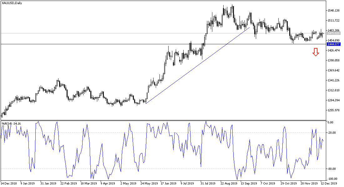 The trade agreement between the two largest economies in the world and the end of the British elections in favor of the Conservative victory, were the most supportive factors for investor’s confidence, and consequently, weak demand for safe havens, the most important of which was the gold, therefore, it dropped during last Friday’s session to the $1462 support before returning to the $1478 resistance, and closed trading last week around the $1457 level. Announcing the details of the recent trade agreement between the United States of America and China, along with the clarity of the Conservatives' view to speed up the Brexit process, might cause the yellow metal to lose the momentum to continue its gains, and push it back to the downward correction again.