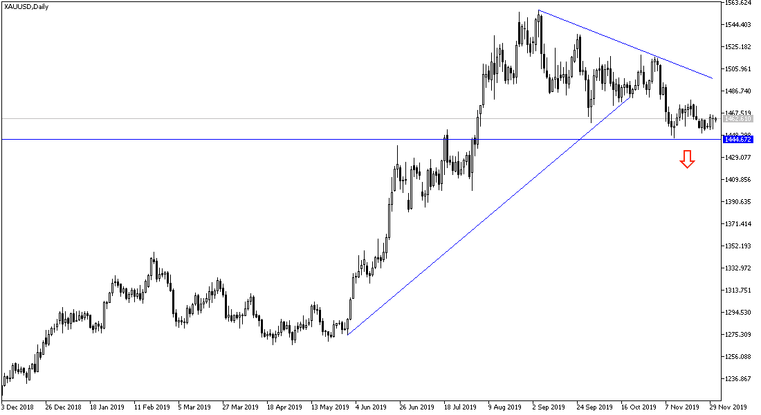 For eight consecutive trading sessions, the price of gold is moving in a limited range between the $1450 support and the $1466 resistance in a cautious wait until the announcement of the deadline for the formal signing of the “Phase 1” trade agreement between the United States and China. Failure of the agreement will be a strong supporter of gold to return to the vicinity of $1500 psychological resistance as soon as possible. But the deal, if satisfactory to the markets, could be a major pressure on the price of gold to test stronger support areas. A limited agreement means the stability of gold prices. The future of Britain's upcoming elections on Dec. 12 will have an impact on the direction of gold investors as well.