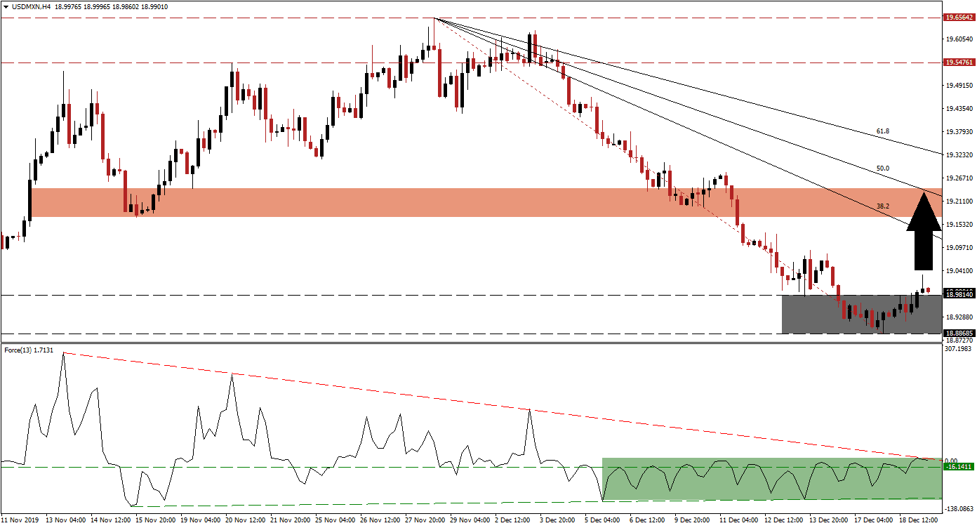 After price action pushed above its support zone located between 18.88685 and 18.98140, a marked by the grey rectangle, a short-covering rally is favored to unfold. This should close the gap between the USD/MXN and its descending 38.2 Fibonacci Retracement Fan Resistance Level. Another bullish development emerged after this currency pair moved above its Fibonacci Retracement Fan trendline. Minor economic data out of the US came in slightly better than economists expected, setting the stage for a counter-trend advance.