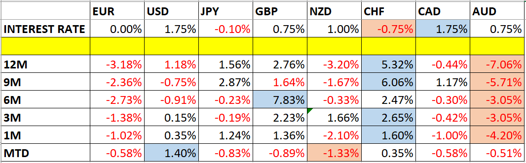 Let’s look at the relevant data of currency price changes and interest rates to date, which we compiled using a trade-weighted index of the major global currencies: