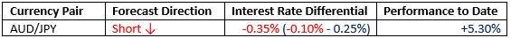 For the month of March, we forecasted that the best trade would be short AUD/JPY. The performance to date has been nicely profitable, as follows: