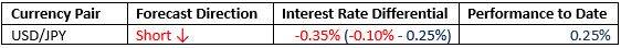 For the month of May, we forecasted that the best trade would be short USD/JPY. The performance to date was negative, as shown below: