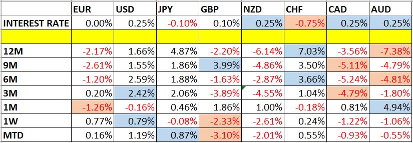 Let’s look at the relevant data of currency price changes and interest rates to date, which we compiled using a trade-weighted index of the major global currencies: