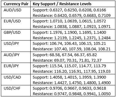 We teach that trades should be entered and exited at or very close to key support and resistance levels. There are certain key support and resistance levels that can be watched on the more popular currency pairs this week.