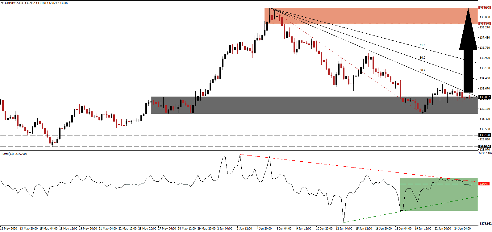 By the end of 2021, the global economy is on course to lose $12 trillion, a value likely to be revised higher, and debt-to-GDP is set to surge past 100%, while the IMF predicts living standards in 95% of countries to decrease. With a debt crisis imminent, due to the favored Covid-19 response by governments and central banks, international finance will fulfill a more defining role in the post-Covid-19 economy. The UK is perfectly positioned, post-Brexit, to take advantage of emerging opportunities. It adds to breakout pressures in the GBP/JPY, after reaching its short-term support zone located between 131.748 and 133.029, as identified by the grey rectangle.