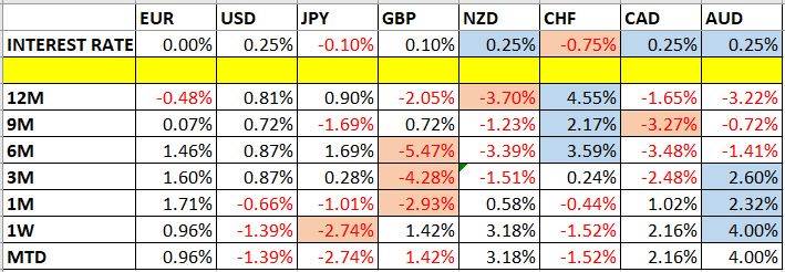 Let’s look at the relevant data of currency price changes and interest rates to date, which we compiled using a trade-weighted index of the major global currencies: