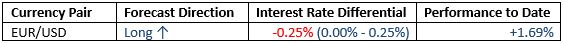 For the month of June, we forecasted that the best trade would be long EUR/USD. The performance so far has been positive, as shown in the table below: