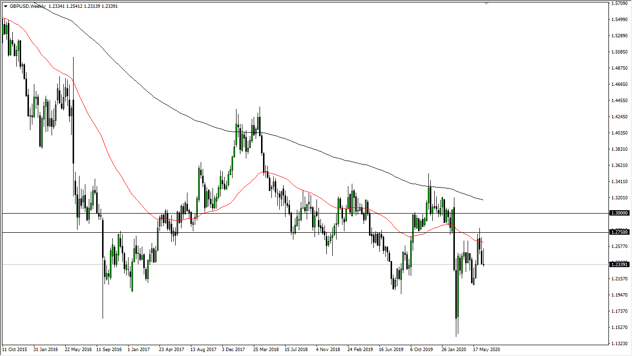 The British pound initially has rallied during the previous week, but then broke down rather significantly. By forming the candlestick that we have, it tells me that rallies will continue to fade, and then eventually the market could go down to the 1.20 level underneath. At this point, the market is starting to come to the realization that we are in more of a “risk-off” world, and of course, with the Brexit causing issues still, it is likely that we are going to see headlines come in and cause issues from time to time. Fading rallies continue to be the best way forward as the noise is deafening.