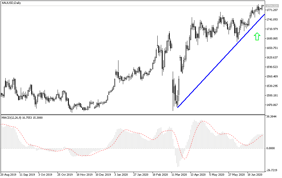 According to gold price technical analysis: The general trend of the yellow metal is still bullish, and despite the technical indicators reaching overbought areas, stability above the $1785 resistance will support the move towards psychological resistance at $1800 and above, which may happen later this week if the markets react negatively With new figures for the second coronavirus wave. There are recent reports that new types of viruses have emerged from China that may have a direct impact on the market.