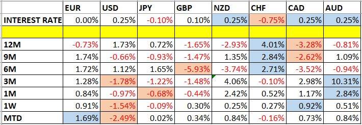 Let us look at the relevant data of currency price changes and interest rates to date, which we compiled using a trade-weighted index of the major global currencies: