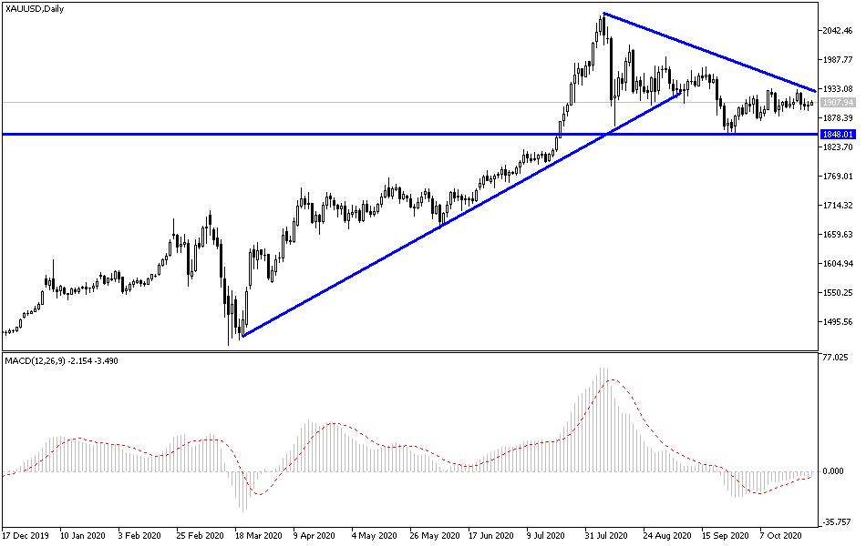 For three trading sessions in a row, gold prices are moving in a limited range between $1892 and $1910 an ounce, where it is stable around at the time of writing. Despite increasing factors that support more gains for the yellow metal price, the USD strength prevents the price of gold from rebounding to achieve stronger gains. Concern about the future of Brexit and who will win the US presidential elections and stimulus plans for the US economy, along with the strength of the second wave of the Coronavirus outbreak are all very important factors supporting the long-term gains in the gold prices. Gold investors are waiting for any dip below $1900 an ounce to consider buying gold.
