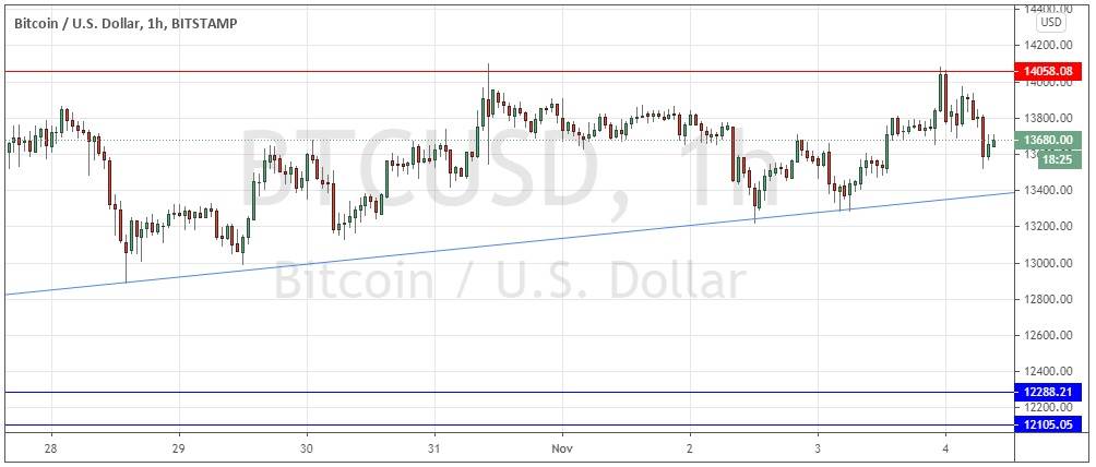 Yesterday’s signals were not triggered, as there was no bearish price action when the resistance level at $13,682 was first reached.