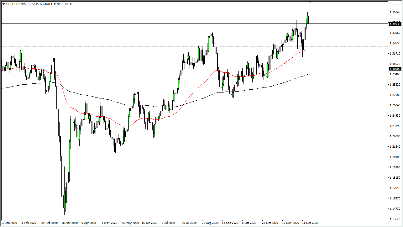 The size of the candlestick is not necessarily anything to be overly concerned about, and it is interesting that we are closing right here at the 1.35 handle. The market will continue to find buyers on dips, because that is what we continue to do. The 50-day EMA is sitting at the 1.3250 level, and that is an area that should continue to offer a “floor" in the market as well. Furthermore, the United States is still discussing stimulus, and that could weigh on the US dollar as well. There are still a lot of moving pieces, and as we go into the weekend, it is hard to tell whether or not we will get any clarity, but one would think that sooner or later somebody has to finally make a decision on some of these big questions.