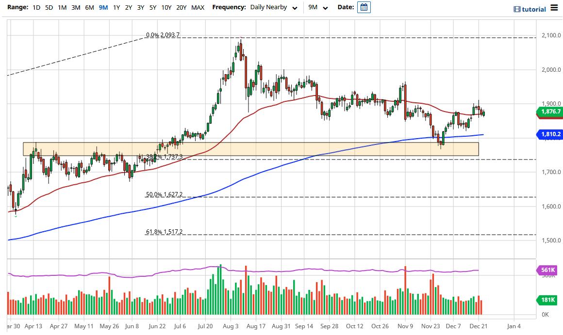 To the downside, I see the 200-day EMA as offering support near the $1810 level. The $1800 level in general would also offer support, so there are plenty of reasons to buy dips. Breaking above the $1900 level could open up a move towards the $1950 level, which has seen a lot of selling previously. After that, the market then will go looking towards the $2000 level. This is a market that will see plenty of buyers on dips, and the uptrend should continue for quite some time. I do believe that the US dollar will continue to get hit, which will help the markets in general.