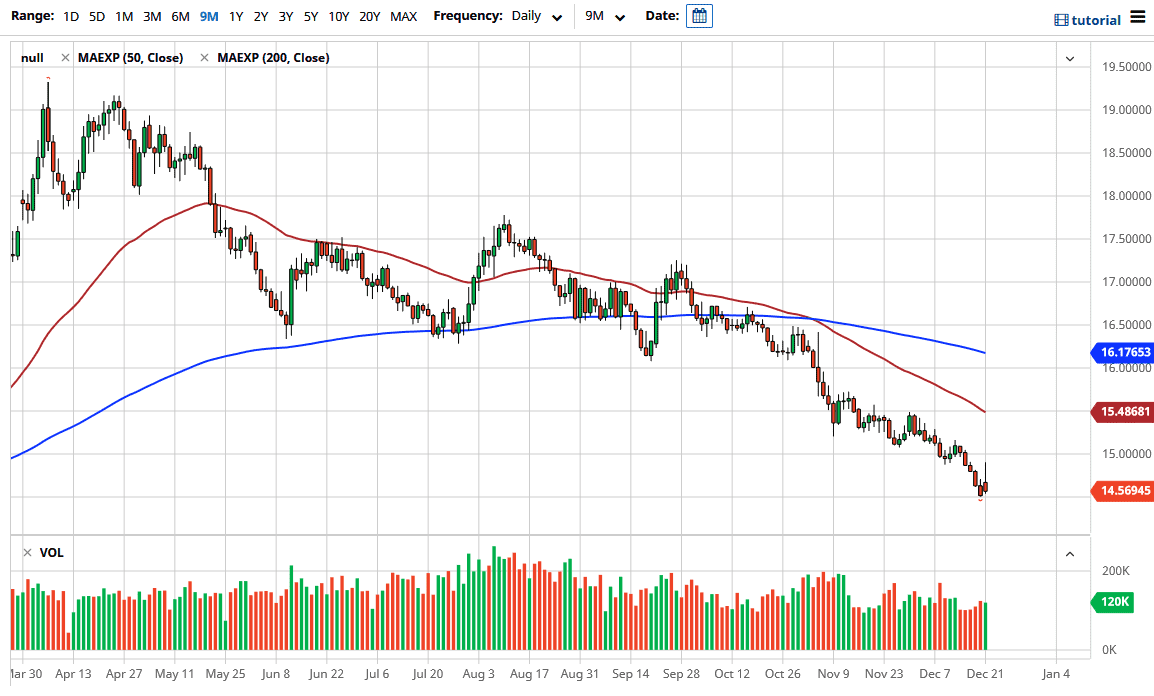 At this point, the market does tend to move in whole figures, so paying attention to a potential move down to the 14 rand level makes quite a bit of sense. It is not until we break above the 50-day EMA that I would be concerned about the downtrend, and at this time of year you have a lot of concerns about price moving far too quickly, so you need to keep your position size rather small. Regardless, buying is all but impossible, so it is probably only a matter of time until we get another selling opportunity.