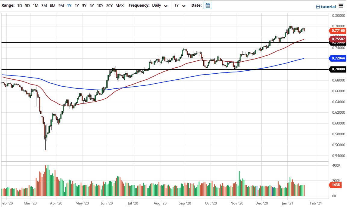 I believe that the 0.75 level would be a very interesting place to get involved, due to the fact that we not only have the large, round, psychologically significant figure, but we also have the previous resistance, which now should offer significant support. Furthermore, the 50-day EMA sits here as well, and a lot of people will be looking at this as an opportunity to get long. To the upside, the 0.80 level will be targeted given enough time, due to the fact that it is a magnet for price on longer-term charts, and this is probably going to continue to see a lot of interest longer-term based upon the idea of increased spending. However, the market may have gotten ahead of itself due to the fact that the size of stimulus coming out of Washington is a question at this point. I do not have any interest in shorting this market quite yet, and I believe that eventually, we will find enough stimulus to turn this thing around.