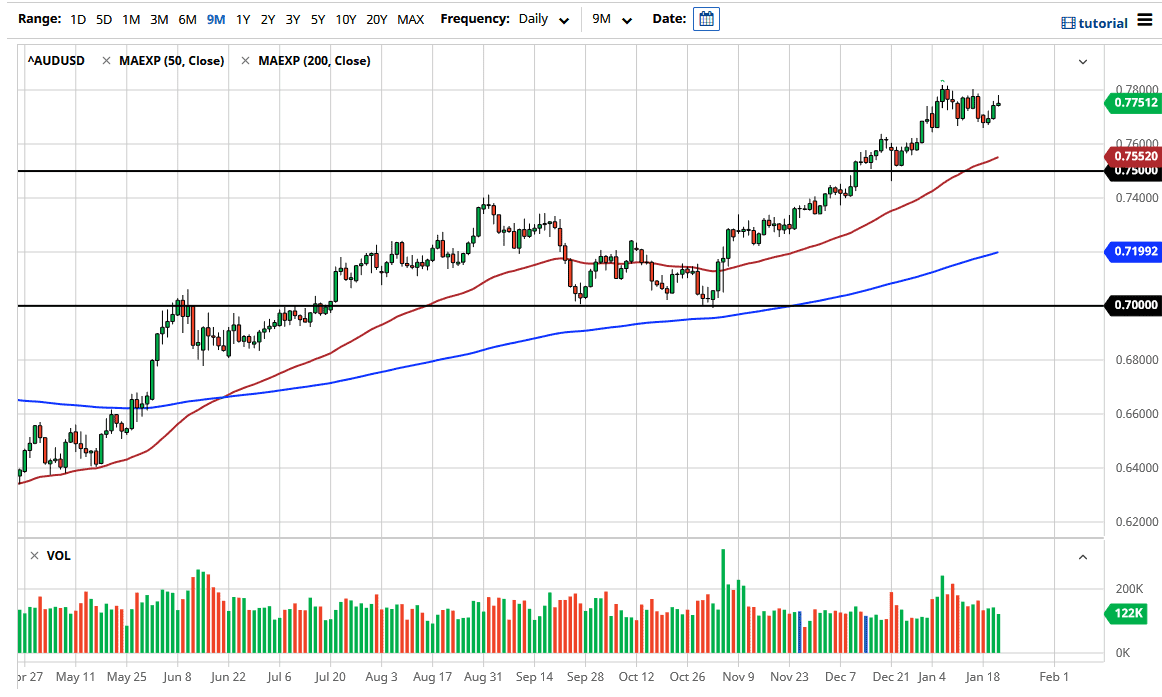 To the downside I would anticipate that the 0.76 level should be supported, right along with the 50 day EMA. Also, you should keep in mind that stimulus being passed in the United States is not as big of a “slam dunk” as Wall Street wanted it to be. Lisa Murkowski and Mitt Romney both have suggested that they are not necessarily looking to push stimulus through the Senate, and in a Senate that will need a 60 vote majority make it happen, that poses a major problem for the Biden administration. In other words, we may not see stimulus for quite some time and that invalidates the argument of eviscerating the US dollar, at least in the short term.